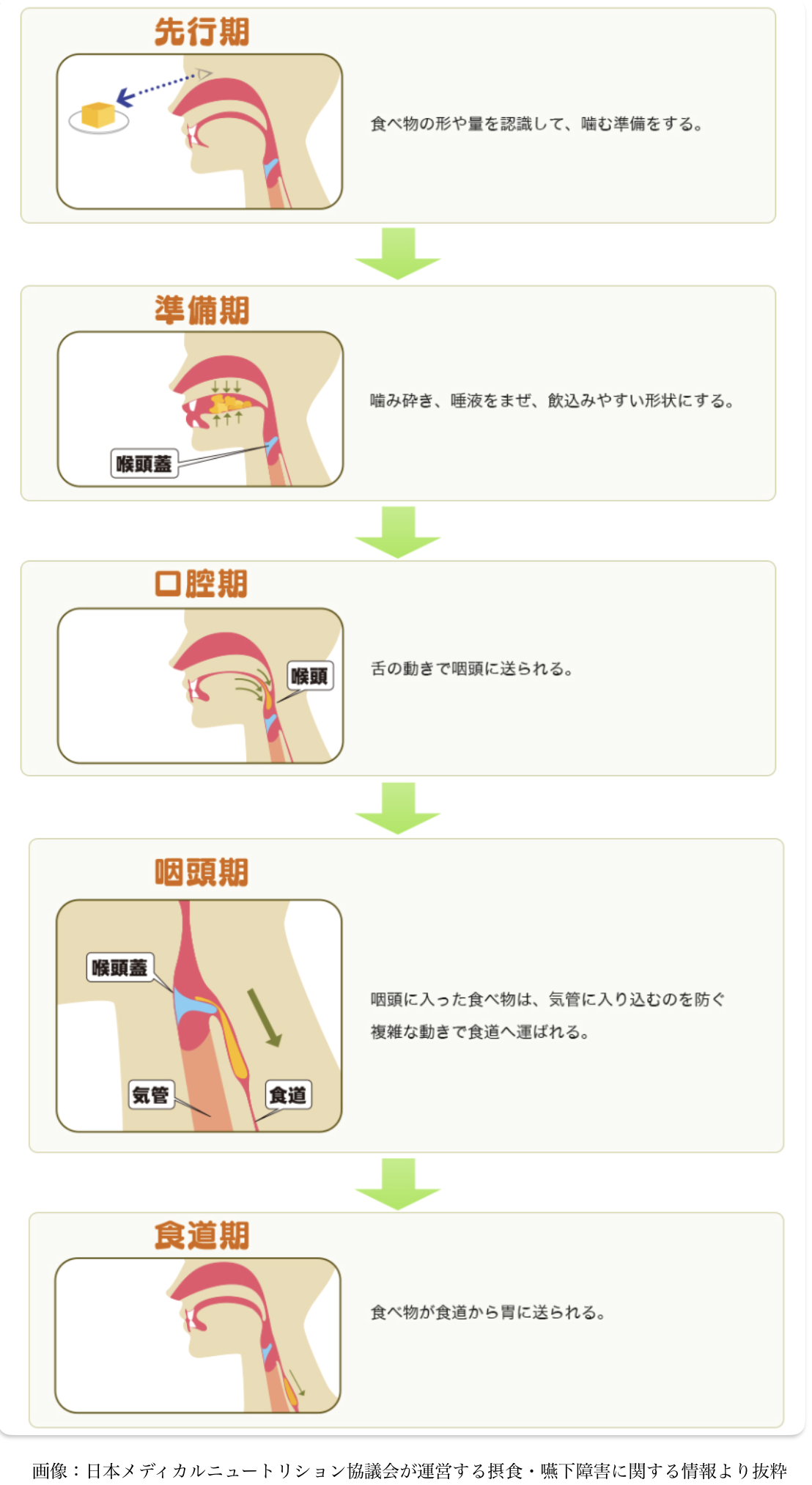 私たちが普段なにげなく行っている「食べる」「飲み込む」という動作。実は、お口からのどを通って胃に届くまでには、”5つの段階(期)”に分かれているのをご存じでしょうか?