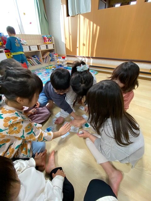 みんなで手作りカルタを作ったり、冬休みの出来事をお話ししたり。