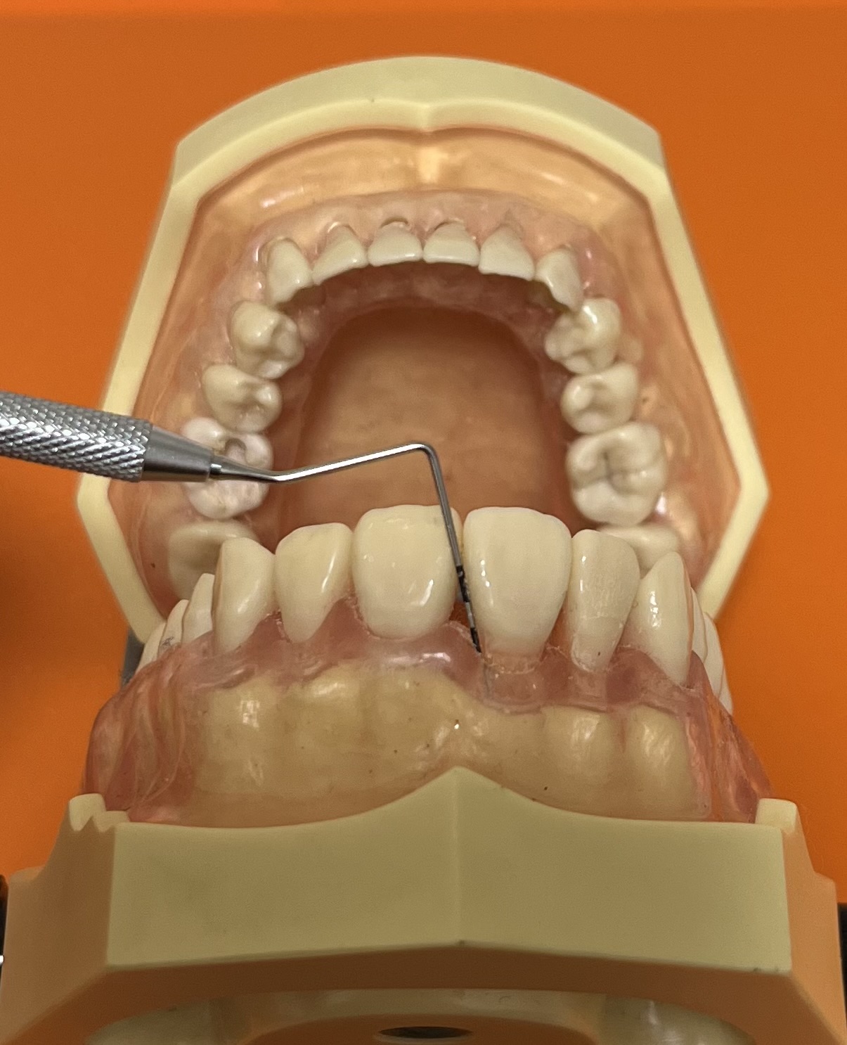 この器具は歯ぐきの溝に入れて、深さや歯ぐきからの出血がないかをみています。