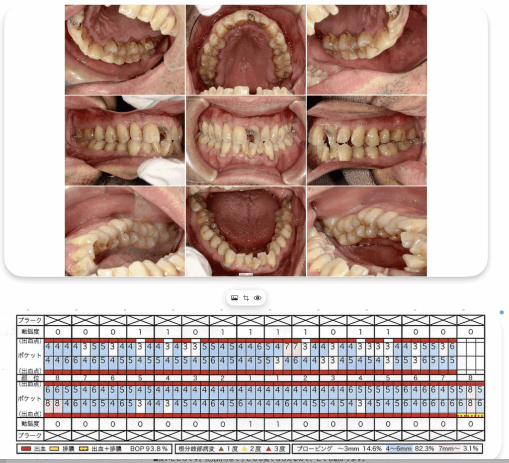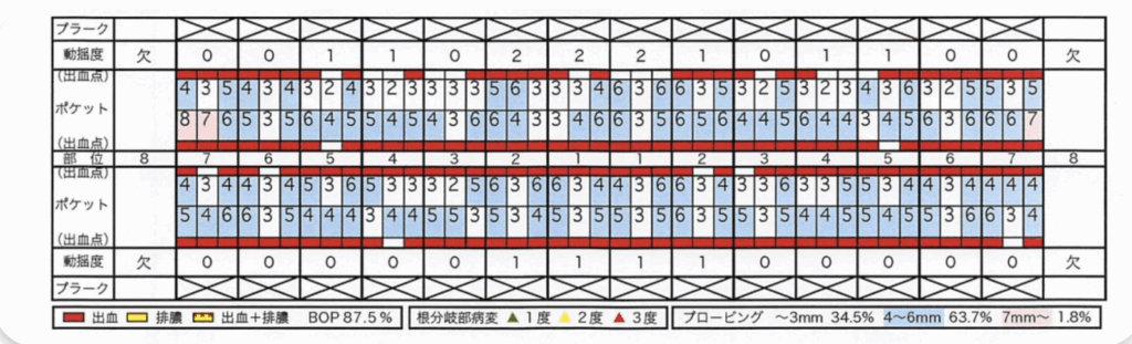 検査では歯周ポケットが深く、ほとんどの部位で出血が見られました。