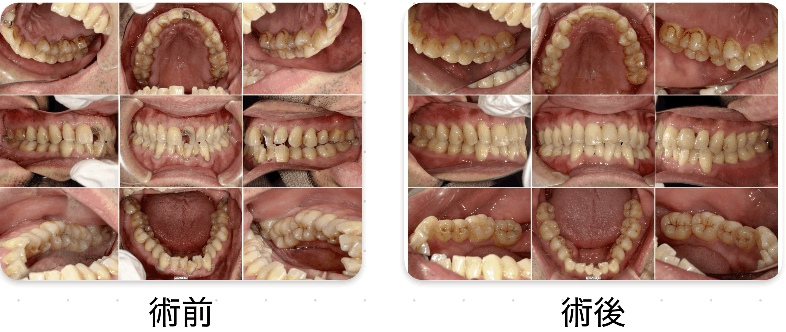治療前と後を比べると、歯石が除去され、歯ぐきの状態が大きく改善しているのが分かります。