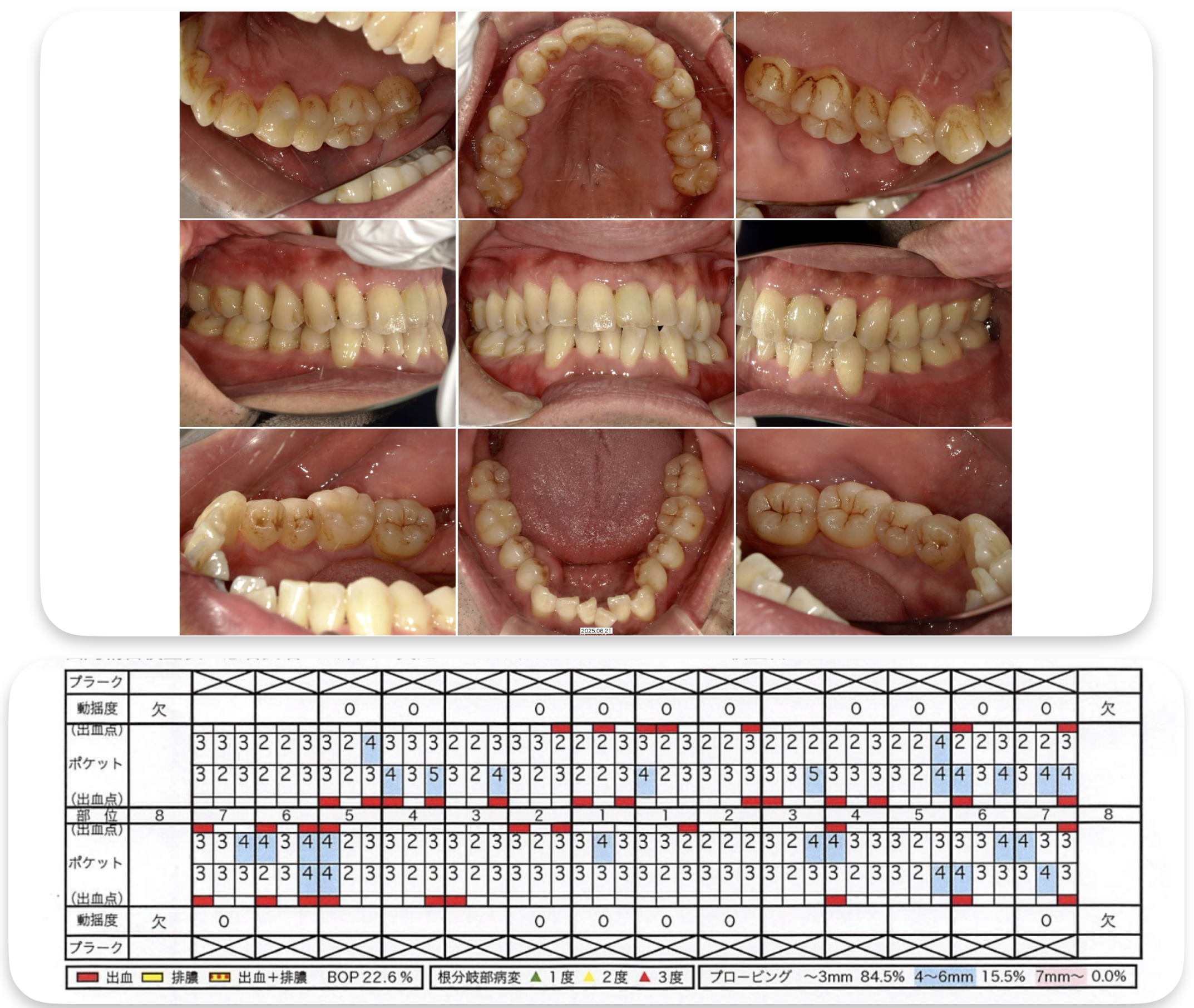 検査では歯周ポケットが深く、ほとんどの部位で出血が見られました。