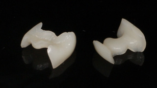 色合いの違うジルコニアを積層した物で作製するので透明感のあるグラデーションが付与でき、天然歯に近い風合いを再現できる。